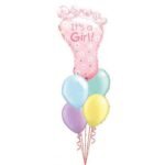 1 x It’s a Girl Supershape Foil (58cm x 82cm), 4 x Pearl Latex (30cm) with HiFloat, Matching Ribbon & Weight, Personalised Greeting Card.