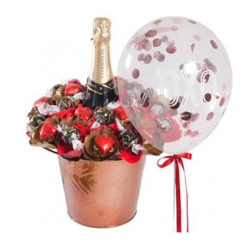 This Bouquet Is Included :  A Bottle Of Chandon Sparkling Wine,10 Lindt Balls,10 Solid Belgian Milk Chocolates ,’xoxo’ Helium Confetti Balloon.Keepsake Bucket.