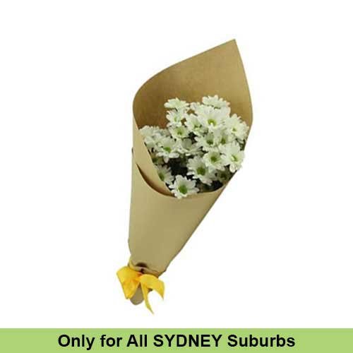This classic white chrysanthemum daisy bouquet is a great value gift for any occassion. Presented in a natural craft paper wrap and bright yellow ribbon, these chrysanthemums are long lasting and super pretty. We gives our great value service across Sydney.