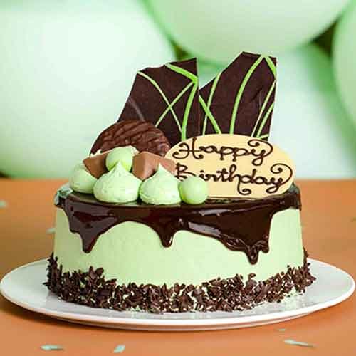 7 Inch Chocolate Mint Party cake , A chocolate sponge layered with a mint flavoured cream. Masked with icing cream, chocolate glaze drip and a range of yummy choc mint goodies on top.