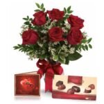 -10%6 fresh-cut red roses accented with stems of limonium, stems of tiki, and fresh greens with greeting card and premium chocolate ( vase not included)