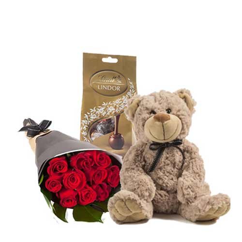 Combo of 10 Red roses Bouquet with 125 Gram Lindt chocolate and 12 Inch Brown teddy